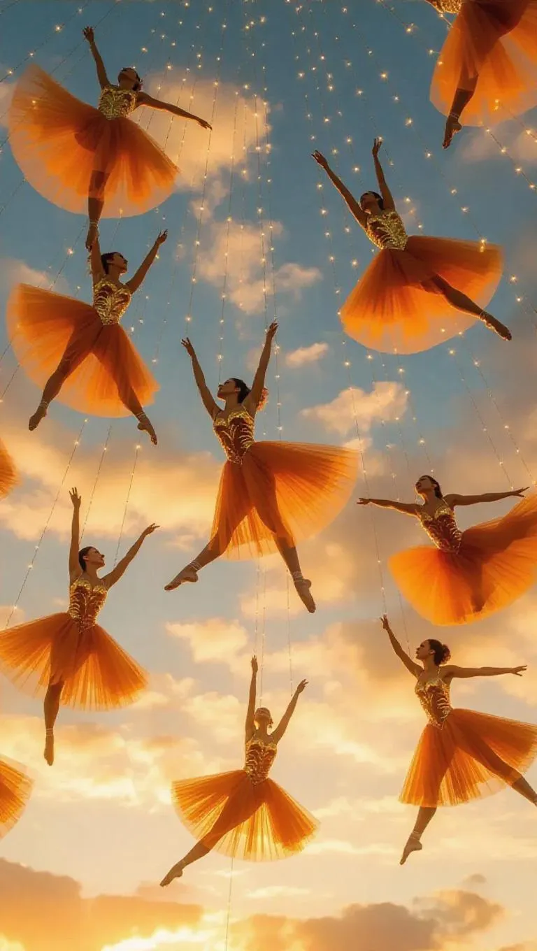 14. Graceful dancers in radiant golden costumes, suspended by star-lit harnesses, perform intricate routines amidst twirling twilight clouds. They twirl and somersault, guided by gentle updrafts, their movements synchronized to soft, ambient music. The sky serves as a vast, ethereal canvas, enhancing the mesmerizing spectacle.