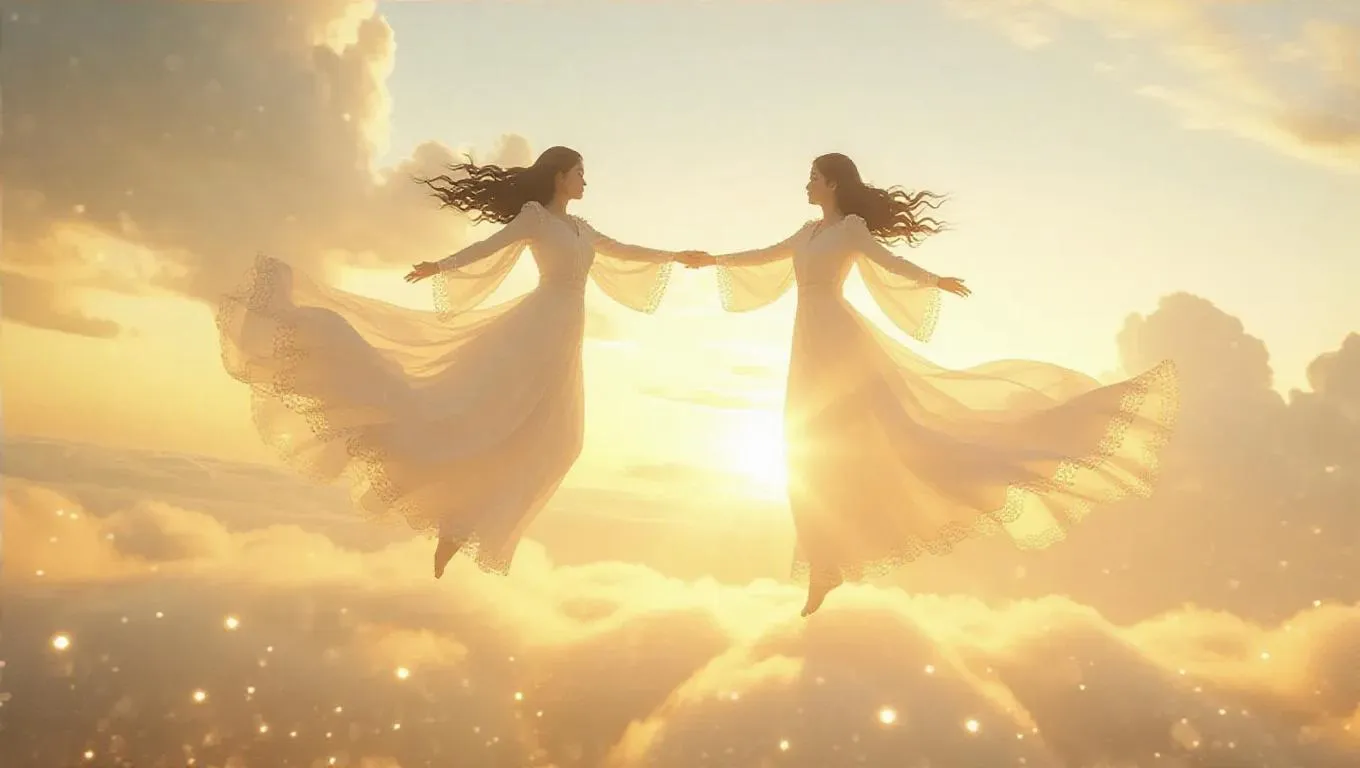 Two ethereal celestial beings waltz across a vast sea of golden clouds, their robes woven from the threads of twilight and evening. Each graceful leap sends shimmering ripples through the air, awakening dormant fireflies that flicker in glowing spirals, while the wind hums an ancient, mystical melody.