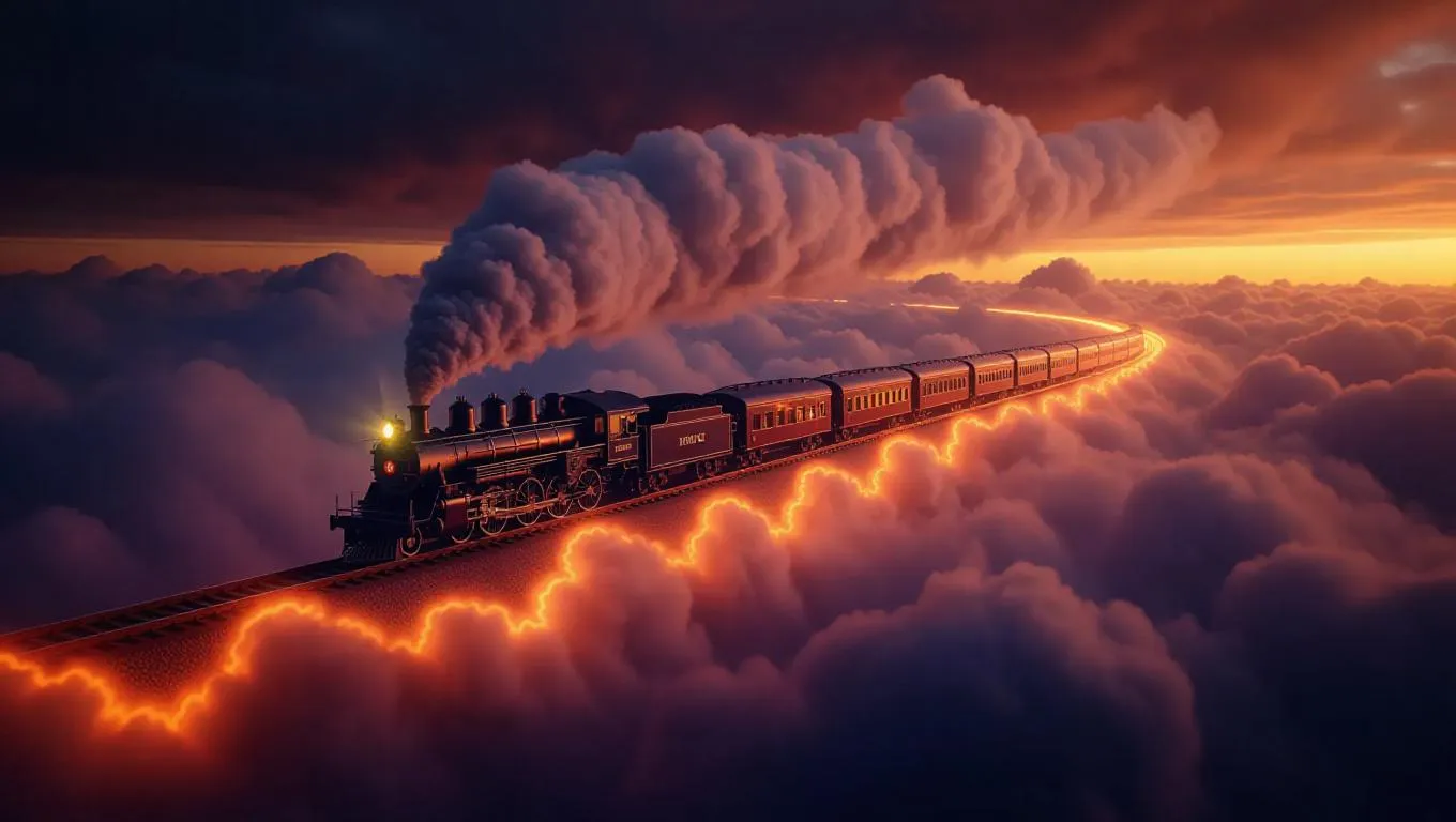 A spectral train made of swirling mist, gliding effortlessly along ethereal tracks laid across fluff-filled clouds, bathed in a soft, celestial glow, with curls of fire trailing behind, creating a dreamlike and enchanting atmosphere.