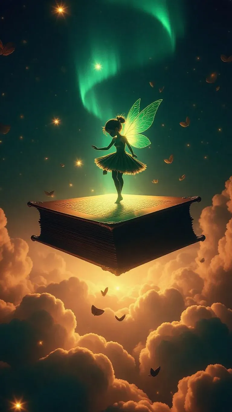 A small, shining pixie balances on an aged, ethereal text suspended mid-air, its surface lit with radiant green henchmarks. Surrounding them, light cotton-like clouds spread infinitely, punctuated with floating fireflies and swirling petals, while a vibrant aurora twines in the faraway, twinkling sky.