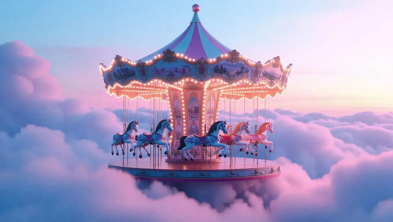 A whimsical carousel spinning gently on fluffy clouds, bathed in the soft hues of a dreamy twilight sky, with pastel-colored horses and twinkling fairy lights, creating a magical and ethereal atmosphere