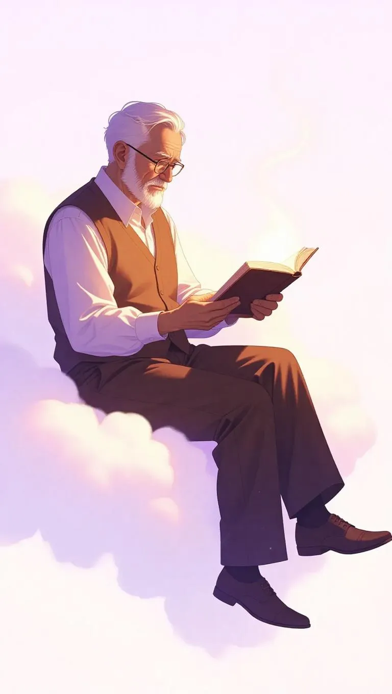 An elderly storyteller perches on a puffy cloud, weaving tales with shimmering threads of starlight that twist into vibrant, ethereal shapes above their hands. Below, the world slumbers under a gossamer blanket of mist, while fireflies dance like distant dreams, ready to come alive.