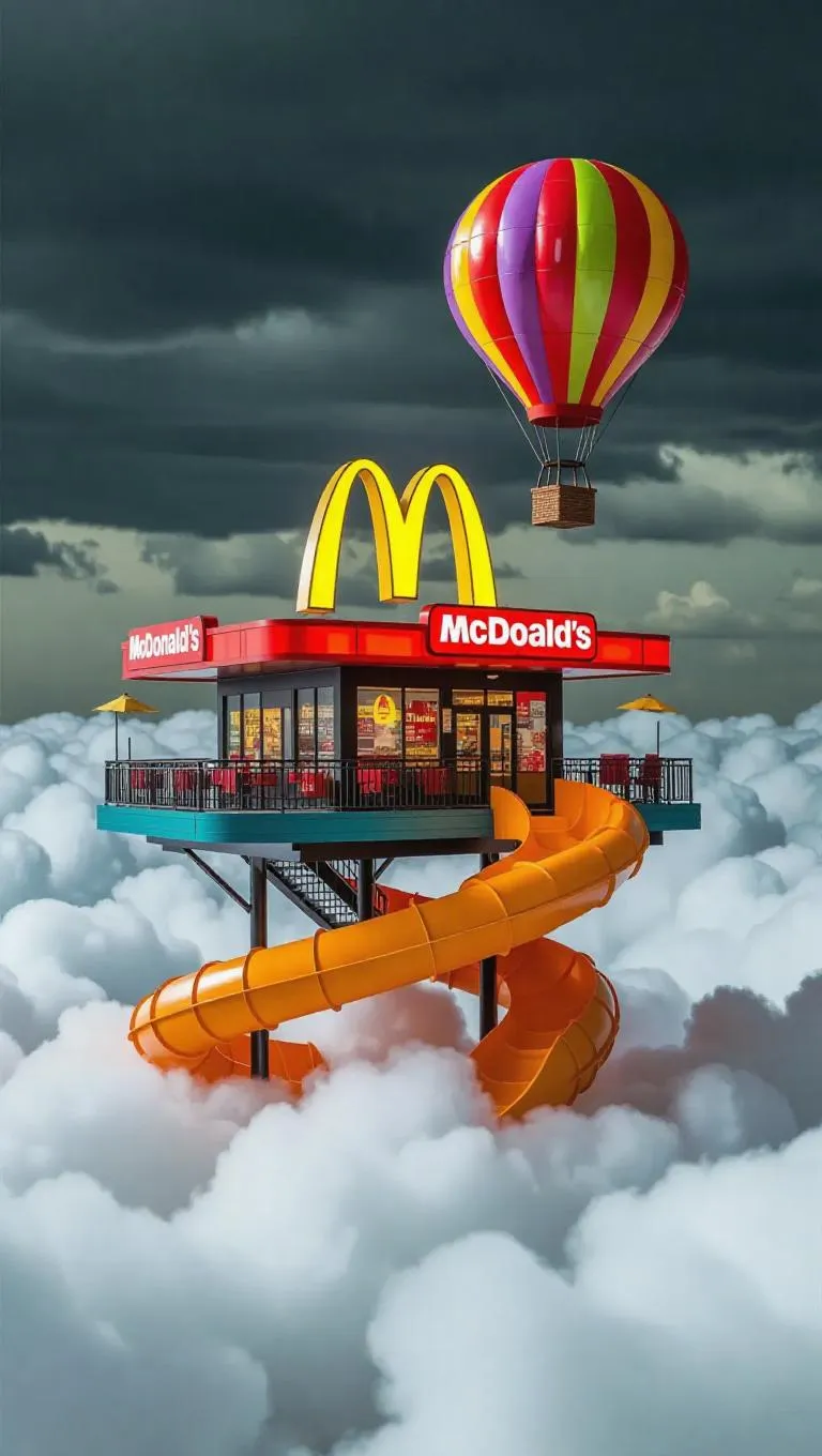 A whimsical McDonald's restaurant floating above a sea of fluffy white clouds, the iconic golden arches glowing warmly against a stormy grey sky. The restaurant features a giant spiral slide and a colorful hot air balloon tethered nearby, adding a playful, fantastical twist.