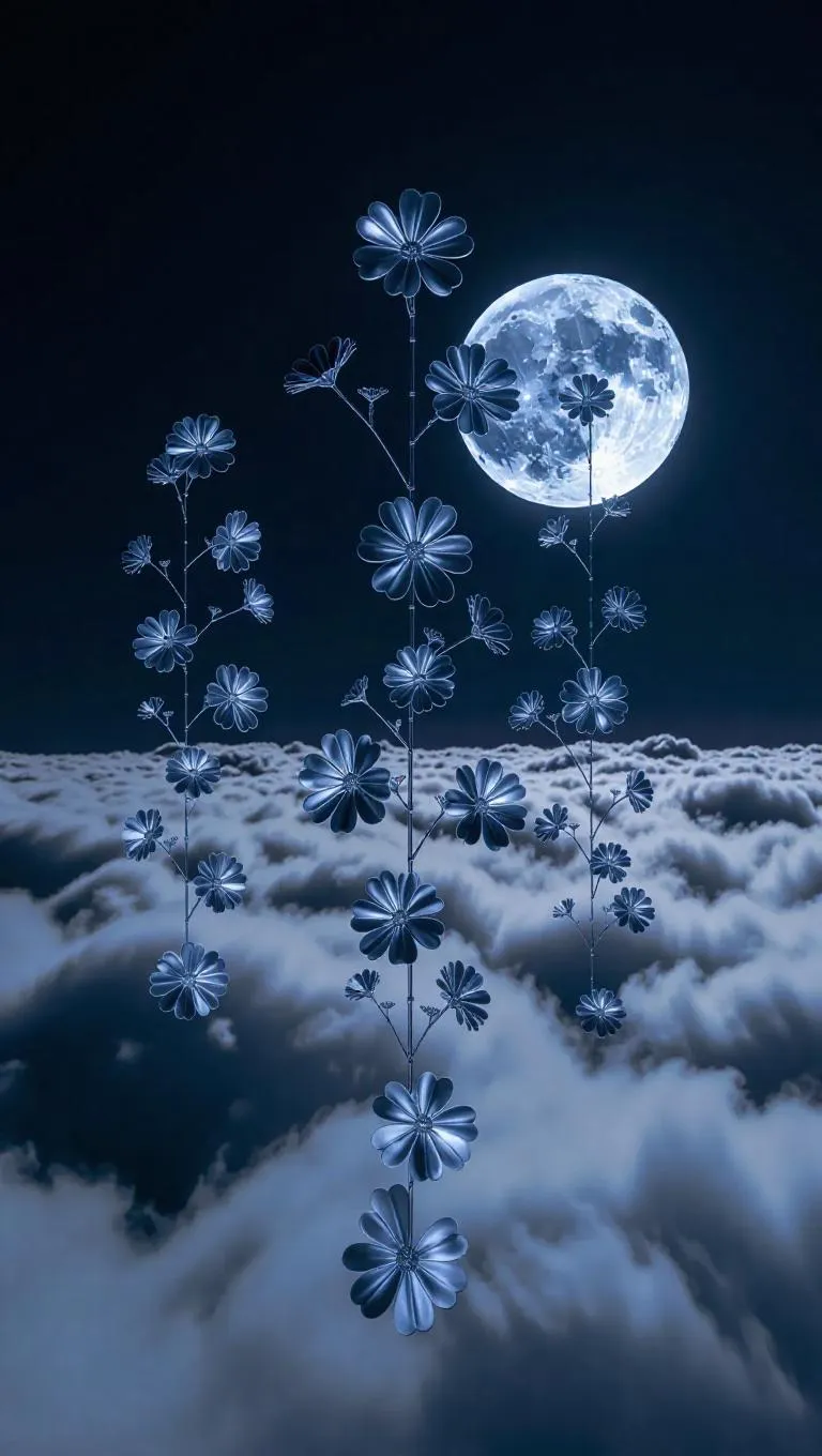 The sculptures are designed using a flexible metal that can hover just above the clouds. They take the shapes of classical figures, flowers, or random geometric patterns. These sculptures appear to be frozen in mid-air, giving off a serene and tranquil vibe. The full moon shines through them, creating dreamy reflections on the clouds below.