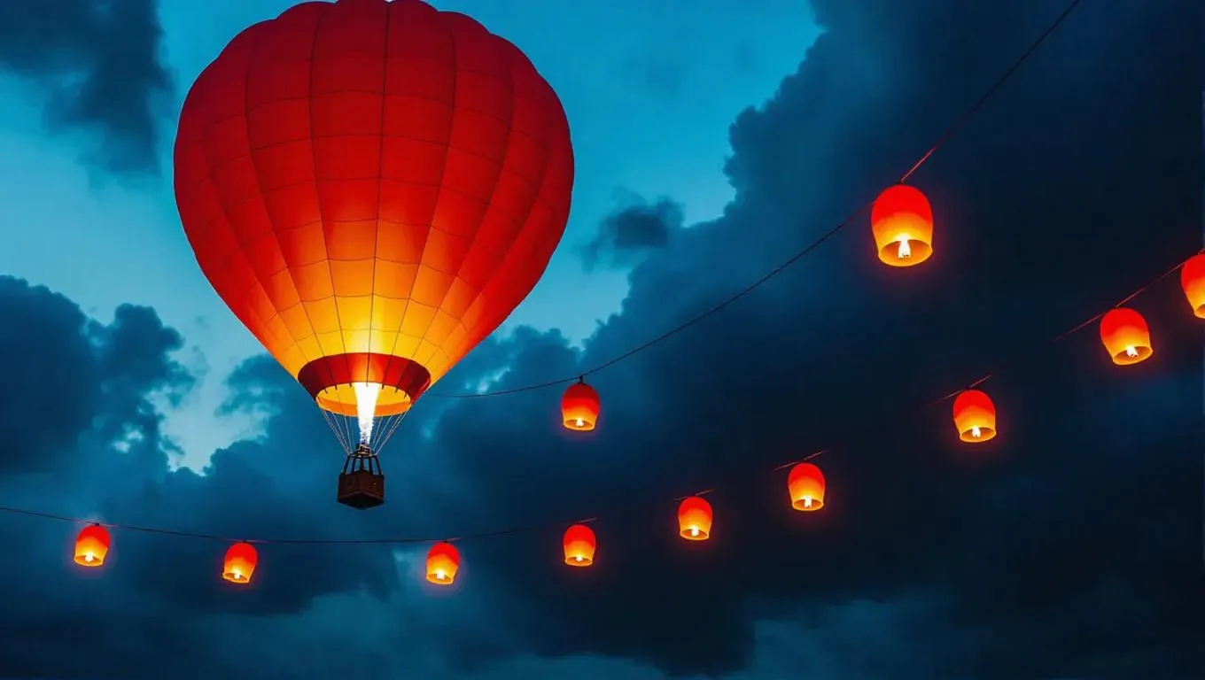 A vibrant hot air balloon tethered to a dark storm cloud, surrounded by glowing lanterns that cast a fierce, dramatic light, creating an ominous atmosphere in a sky painted with deep blues and grays.