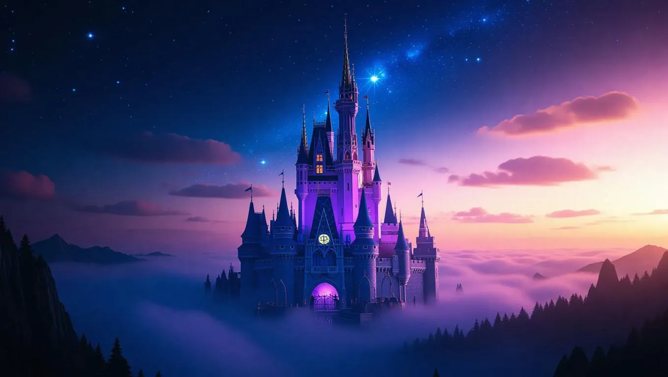A radiant castle drifting under a sky full of stars, glowing with bright starlight, with towering spires and intricate designs casting elaborate shadows, enveloped in a soft cosmic mist, creating a serene and wondrous atmosphere