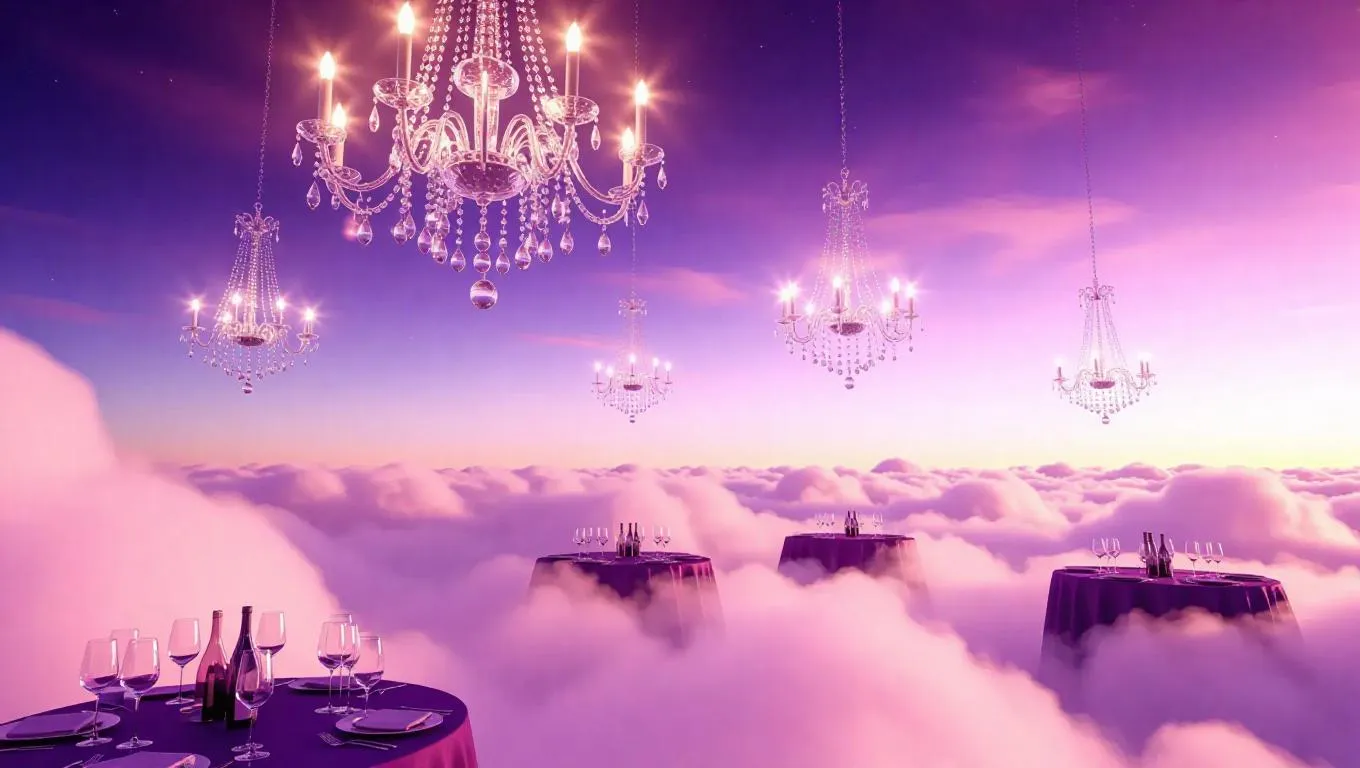Above the clouds, a luxurious wine tasting event occurs on a dazzling cloud platform. Stardust chandeliers filter warm lights, enhancing the atmosphere. Tables are clothed in deep space tablecloths, accompanied by crystal wine glasses and polished forks, inviting sophistication.