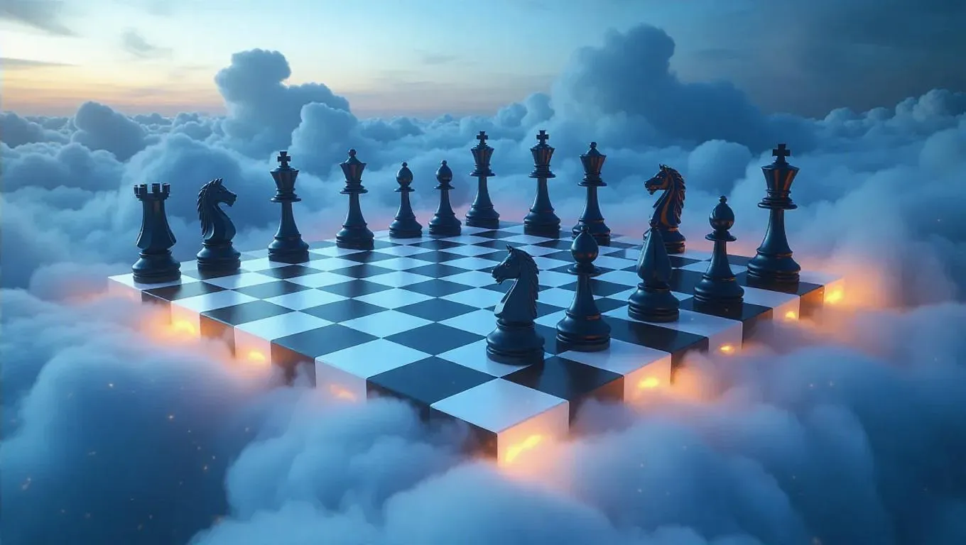 A colossal, shimmering chessboard floats serenely above the clouds, its black and white squares crafted from ethereal mist. Each square glows softly, edges lined with flickering fireflies. Massive, living chess pieces—knights as noble lions, bishops as flowing shadows—move gracefully, casting long shadows on the cloud-sea below.