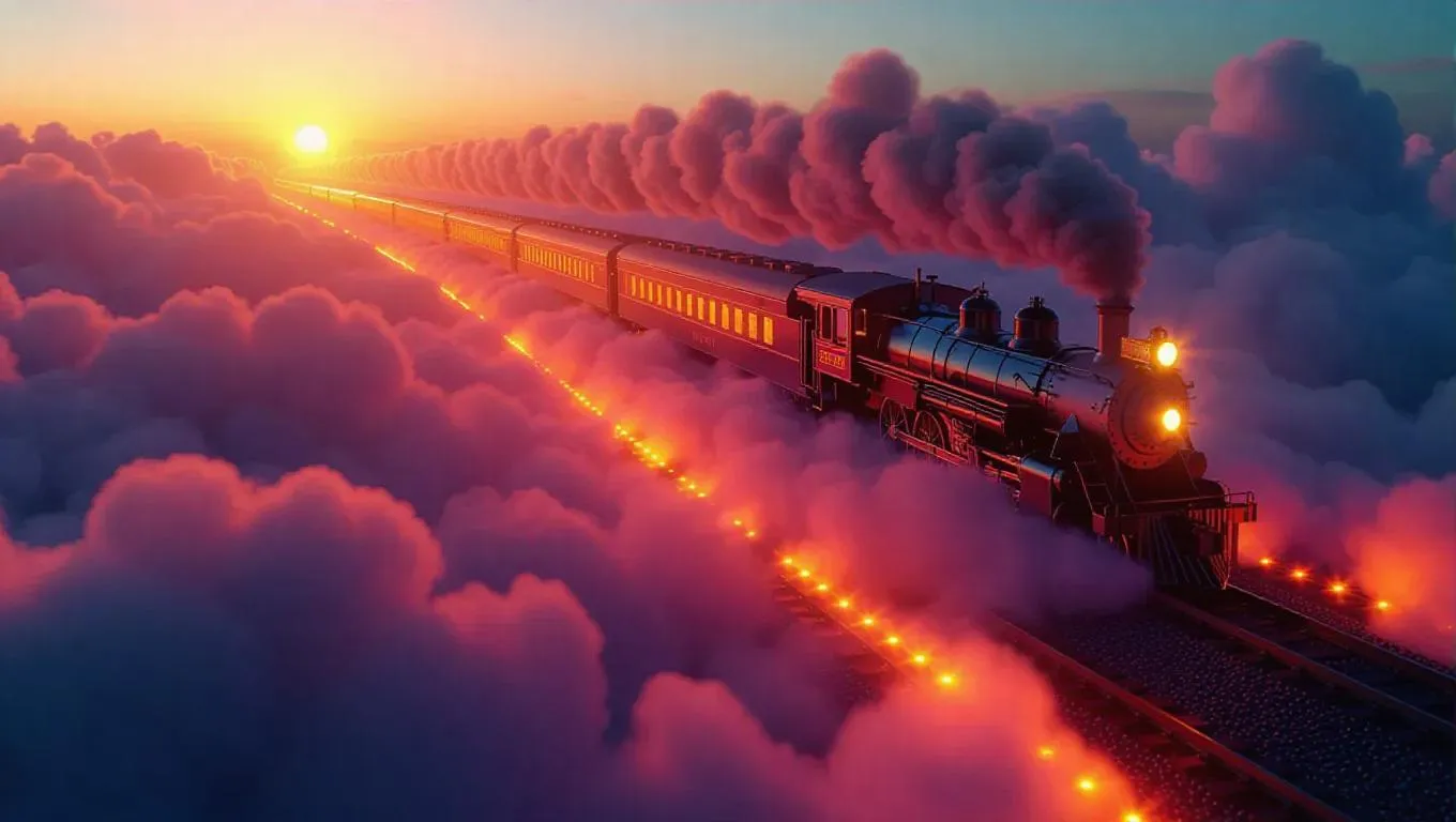 A spectral train made of swirling mist, gliding effortlessly along tracks of light laid across fluffy marshmallow clouds, bathed in a soft, dreamy glow, with bright flames trailing behind, creating a dreamlike and enchanting atmosphere.