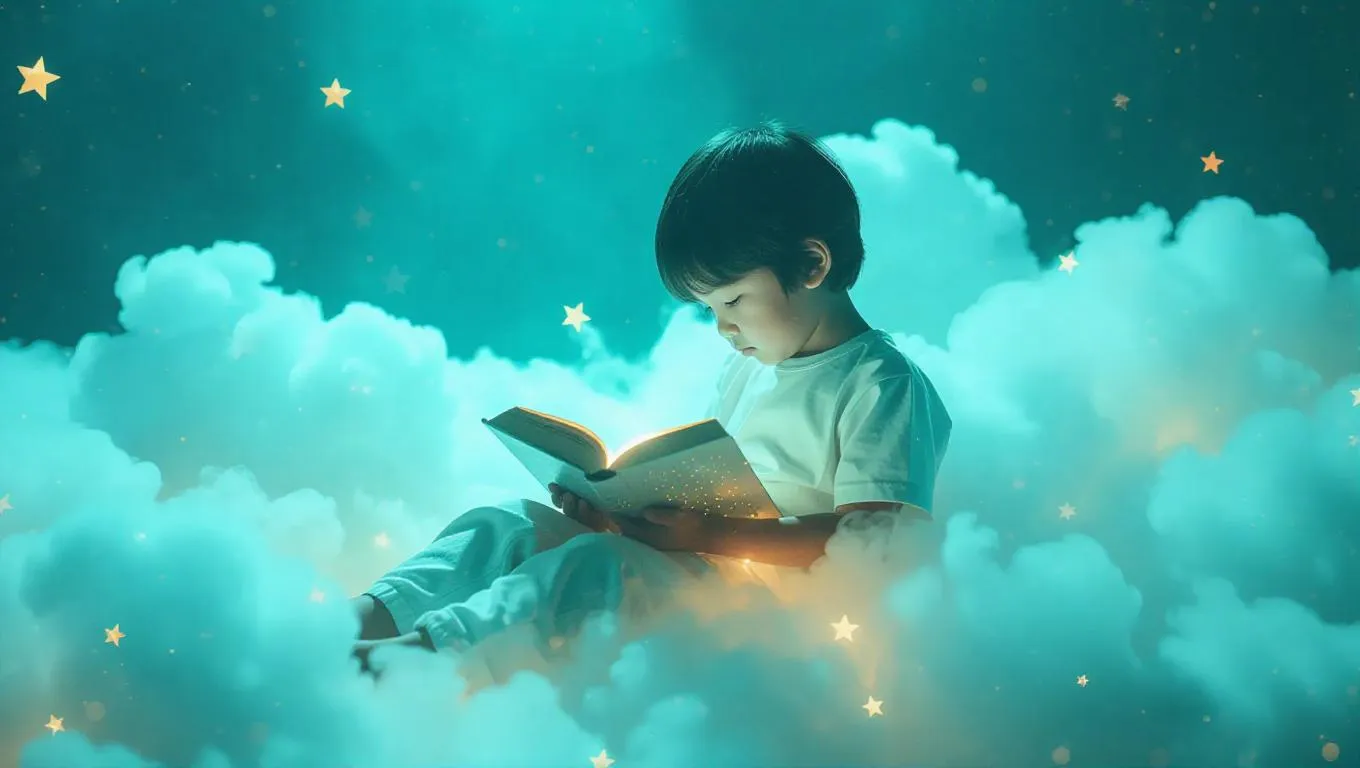 A child resting on a fluffy cloud, absorbed in a glowing book, glowed softly in teal lighting, surrounded by winking stars and gentle mist, creating a magical and serene atmosphere