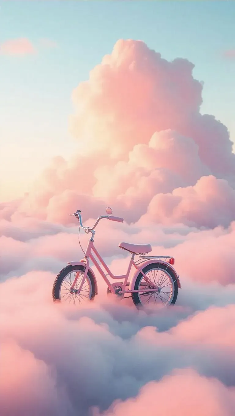 A tricycle parked on a fluffy, ethereal cloud, overlooking a horizon of soft pastel colors, with wisps of peach clouds floating below, creating a playful and whimsical atmosphere.