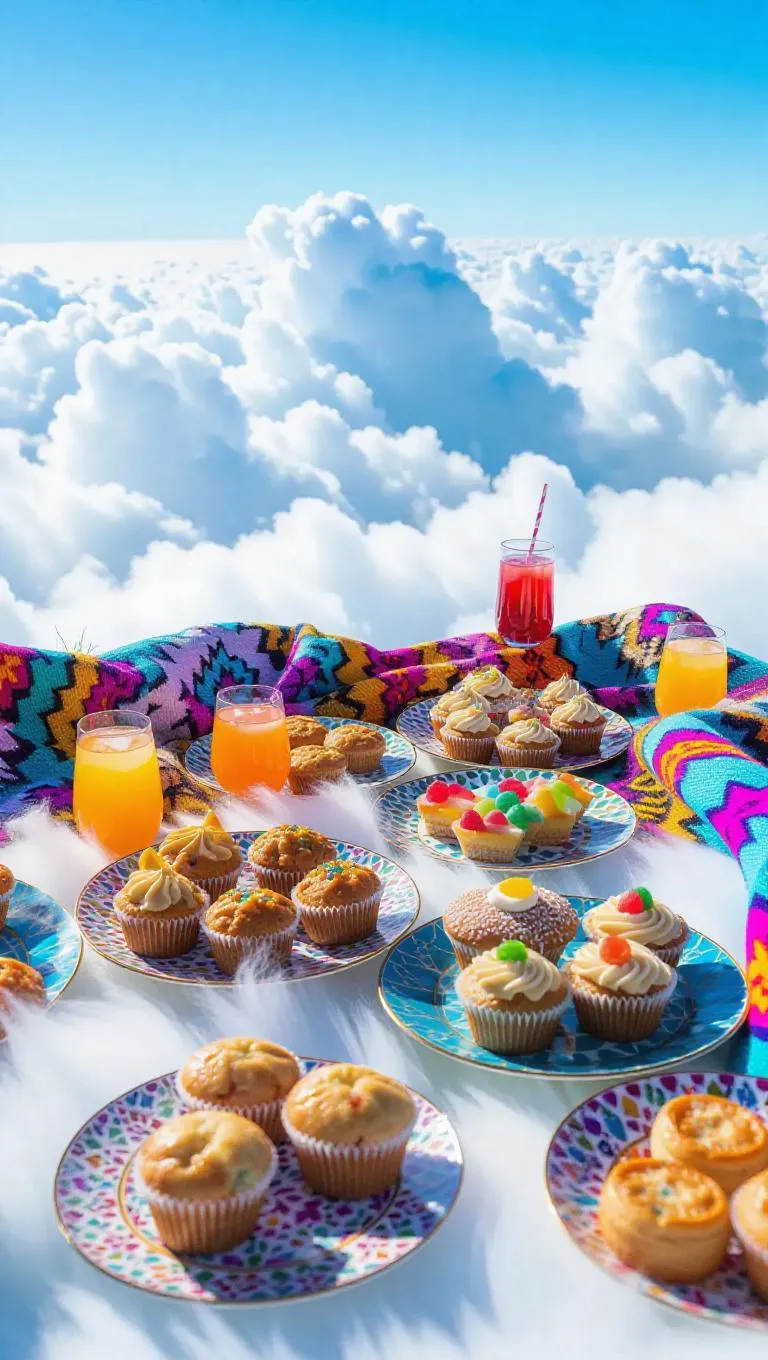 Above the clouds, a bohemian gathering unfolds on a vast, cushioned expanse of soft, fluffy clouds. An eclectic blanket, shimmering with tiny star-like sparkles, is spread out, adorned with an array of colorful treats. Mosaic plates hold muffins made with light batter as airy as clouds, filled with slices of juicy tropical fruits that seem to capture the essence of the sun, surrounded by delicious pastries and sparkling beverages.