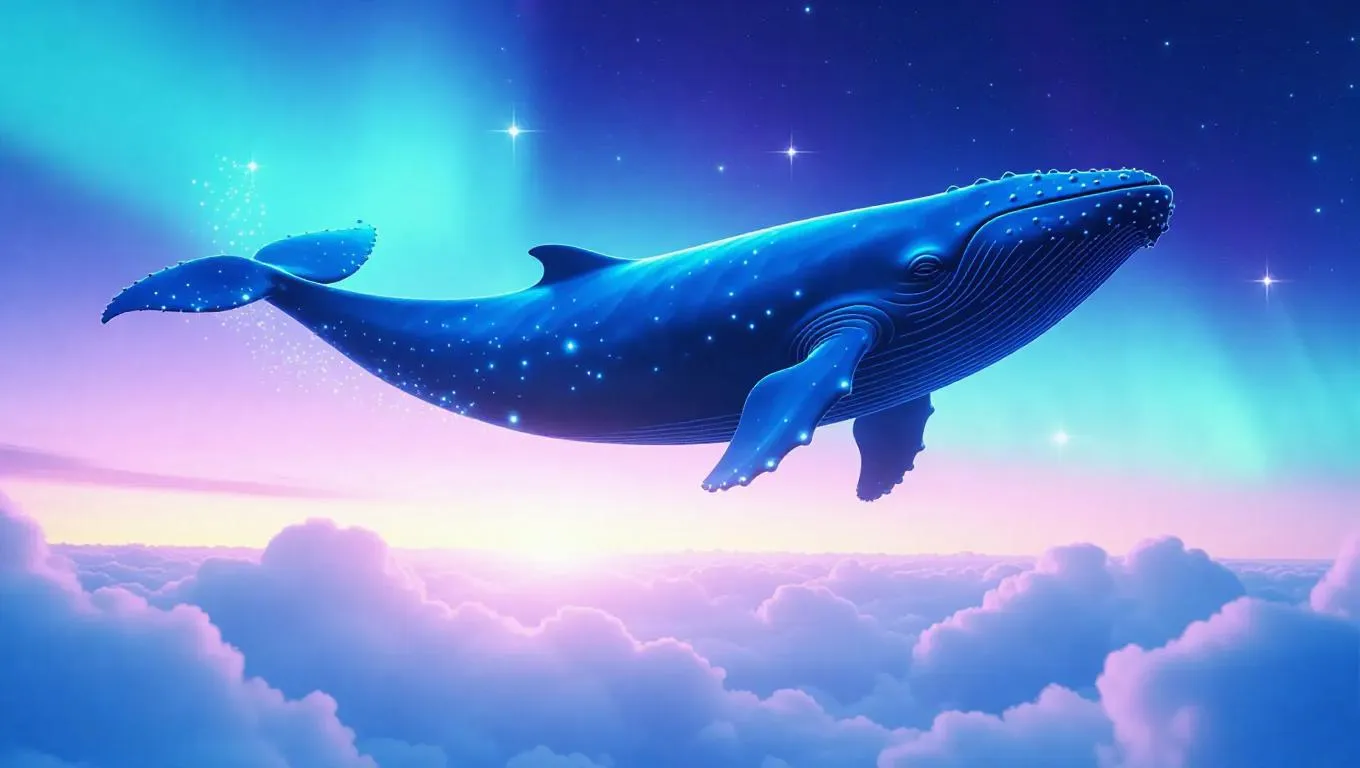 A colossal whale soaring through the aurora-lit sky, gliding above puffy clouds, with sparkling diamonds entwined around its body, casting a mystical glow, creating a surreal and enchanting scene