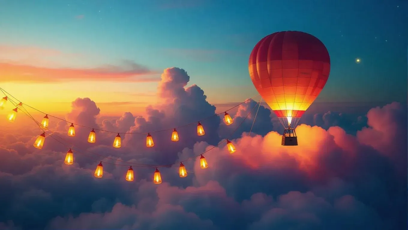 A stylized hot air balloon tethered to a puffy dream cloud, surrounded by glowing lanterns that cast a whimsical, fairy-tale light, creating a storybook atmosphere in a sky painted with enchanting colors.