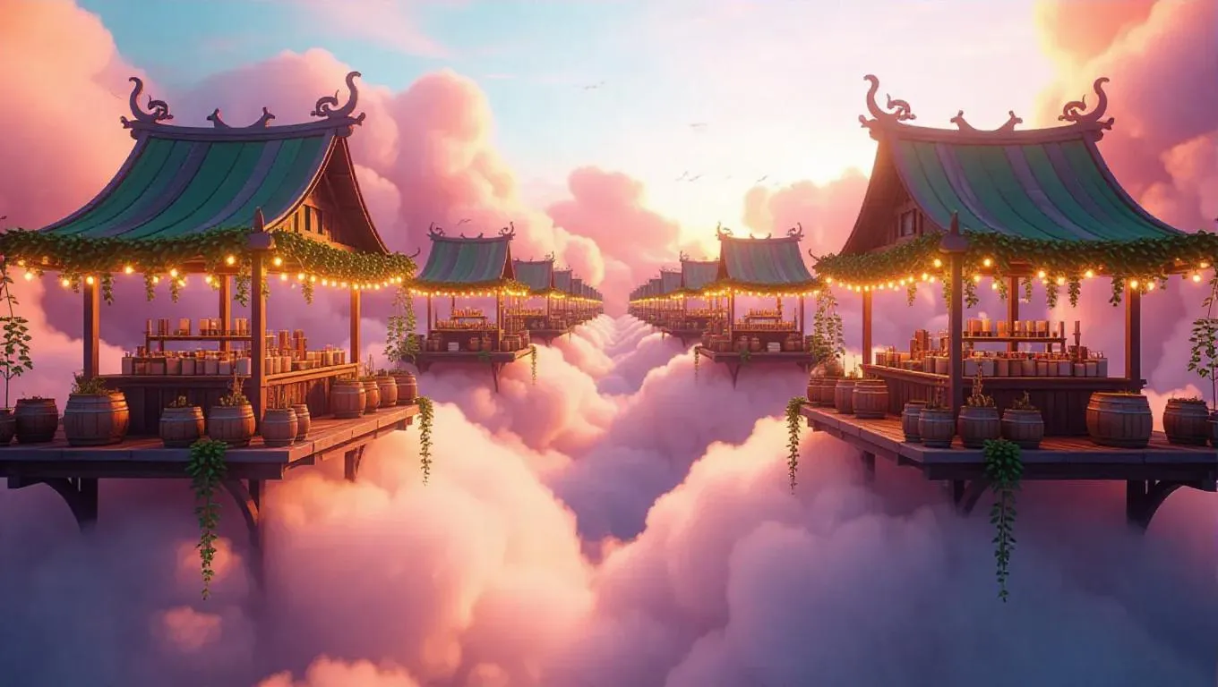A whimsical floating market atop fluffy clouds, featuring nature-themed stalls adorned with greenery and dreamlike, ethereal lighting that casts a magical glow, creating a surreal and enchanting atmosphere.