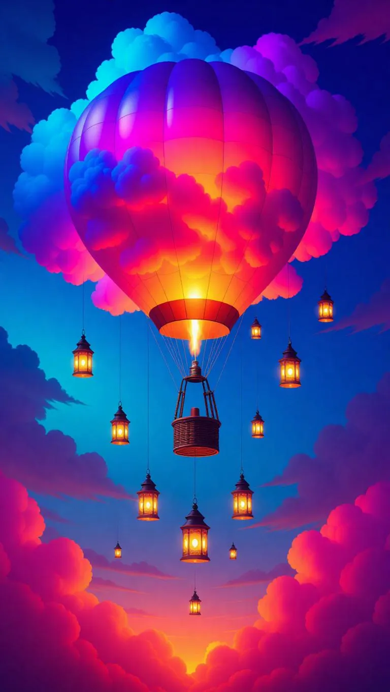 An artistic hot air balloon tethered to a brushstroke cloud, surrounded by glowing lanterns that cast a creative, colorful light, creating an imaginative atmosphere in a sky painted with splashes of color.