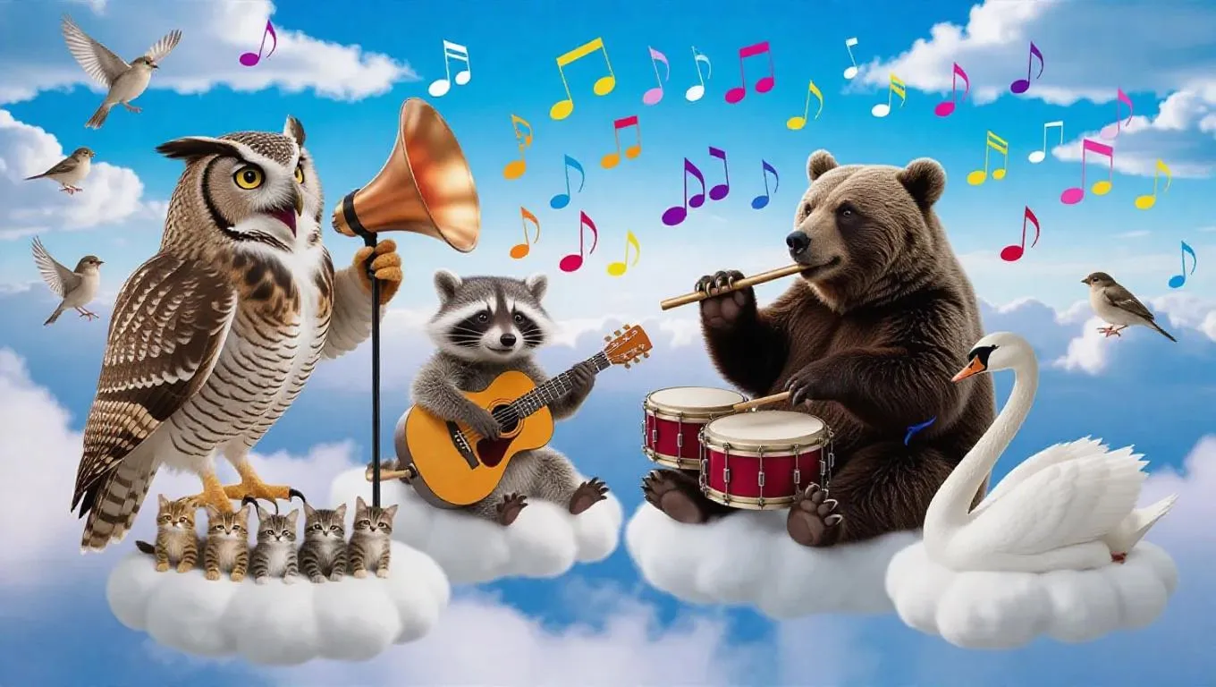 High above the clouds, a charming animal concert takes center stage. A melodious owl with a rich, warm voice croons into a glossy conch shell microphone, while a crafty raccoon strums a guitar crafted from a multicolored branch, its strings made of bright spider silk. A burly bear pounds rhythmically on drums carved from soft clouds, and a lovely swan plays a flute made of a long, shiny reed, sending sweet notes fluttering through the air. Their audience, a flock of gregarious sparrows and a group of big-eyed kittens, sit on fluffy cloud benches, swaying and clapping along as the music fills the sky with happiness.