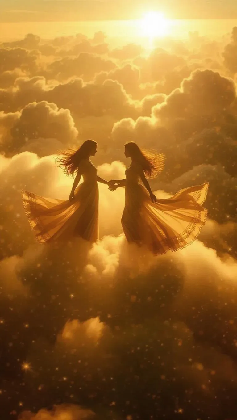Two ethereal celestial beings waltz across a lush sea of golden clouds, their garments woven from the threads of dawn and dusk. Each graceful leap sends shimmering ripples through the air, awakening dormant fireflies that spiral in glowing patterns, while the wind hums an ancient, mystical melody.
