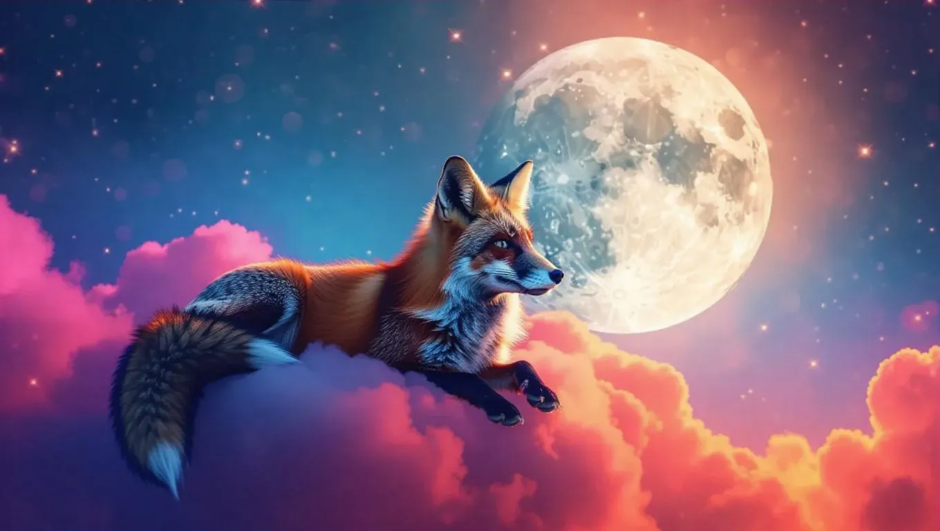 A fox nestled comfortably on a vibrant cloud, illuminated by the bright, whimsical glow of a full moon, surrounded by shimmering stars and playful gusts of wind, creating a dreamy and enchanting atmosphere.