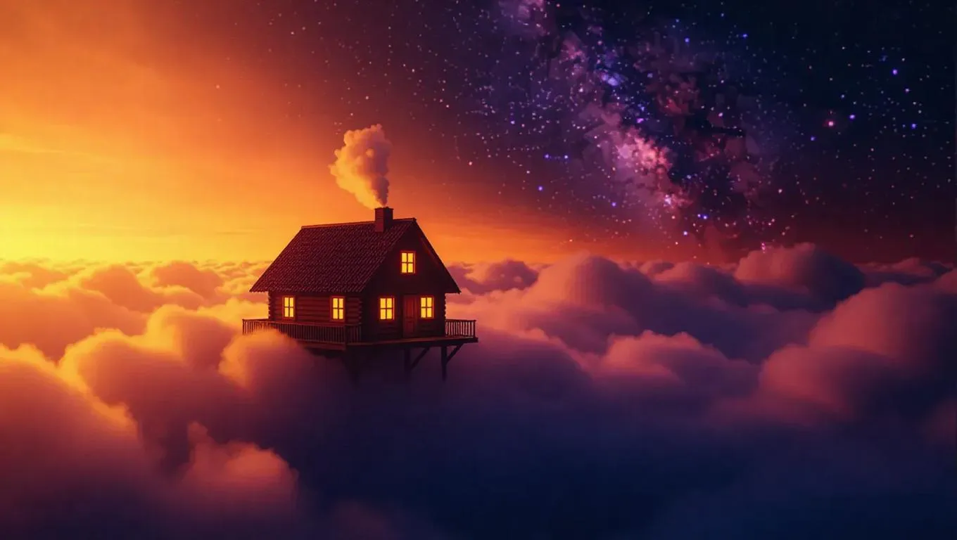 A charming cabin resting on a billowy cloud, warm golden light glowing from its windows, cloaked in dreamy mist. Above, colorful cosmic dust swirls through the night sky, creating a magical and serene atmosphere.