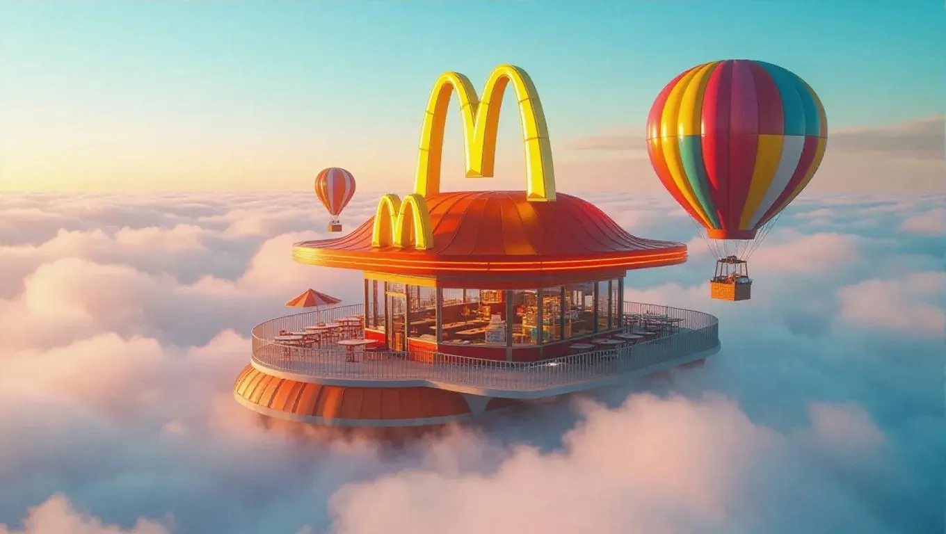 A whimsical McDonald's restaurant floating above a sea of fluffy white clouds, the iconic golden arches glowing warmly against a bright midday sky. The restaurant features a giant spiral slide and a colorful hot air balloon tethered nearby, adding a cheerful, joyful atmosphere.