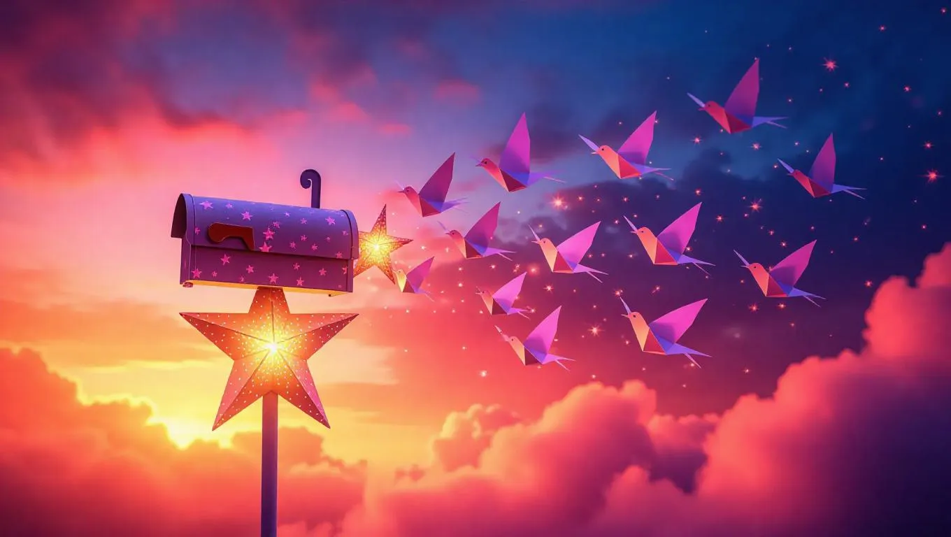 A whimsical mailbox balanced on a shimmering star, with delicate paper birds fluttering out, creating a magical sky filled with vibrant colors and soft, ethereal light.