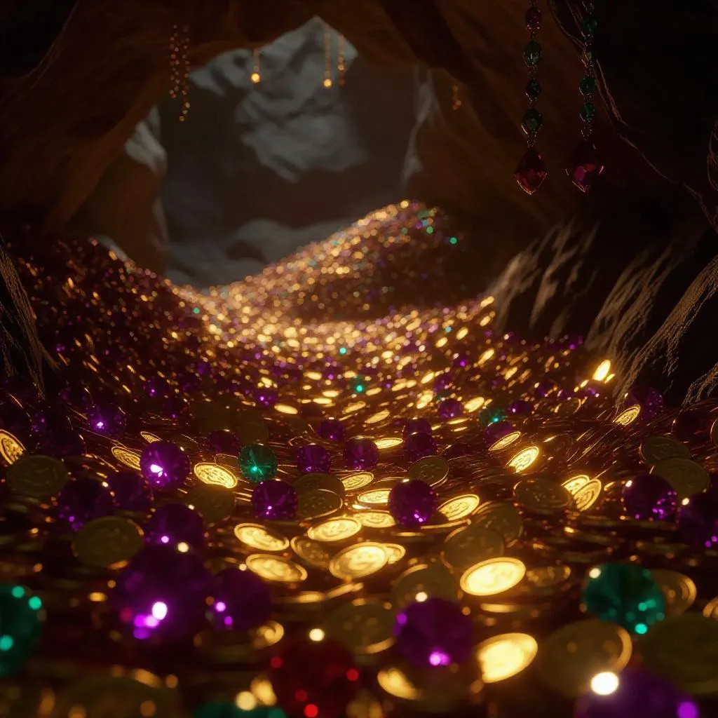 Generate cinematic AI images of treasure-filled caves with golden coins, multi-colored gems, and scattered jewelry. Use VivaGo's AI tools to create stunning visuals with soft illumination, vibrant textures, and professional effects for games, stories, or marketing. Transform text prompts into dazzling cave scenes effortlessly.