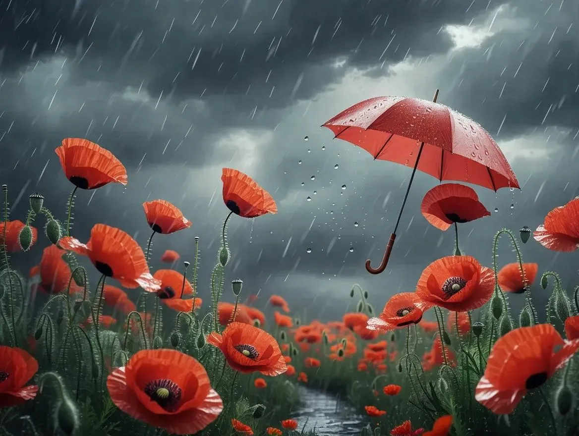 Capture the ethereal beauty of vibrant red poppies in a surreal rainy garden scene. AI-generated digital photo style with wildflower fields, flying umbrellas, raindrops, and dark skies. Moody atmosphere meets magical realism through dramatic lighting, macro photography, and high-contrast botanical details. Perfect for concept art, dreamy nature photography, or whimsical compositions with shallow depth of field.