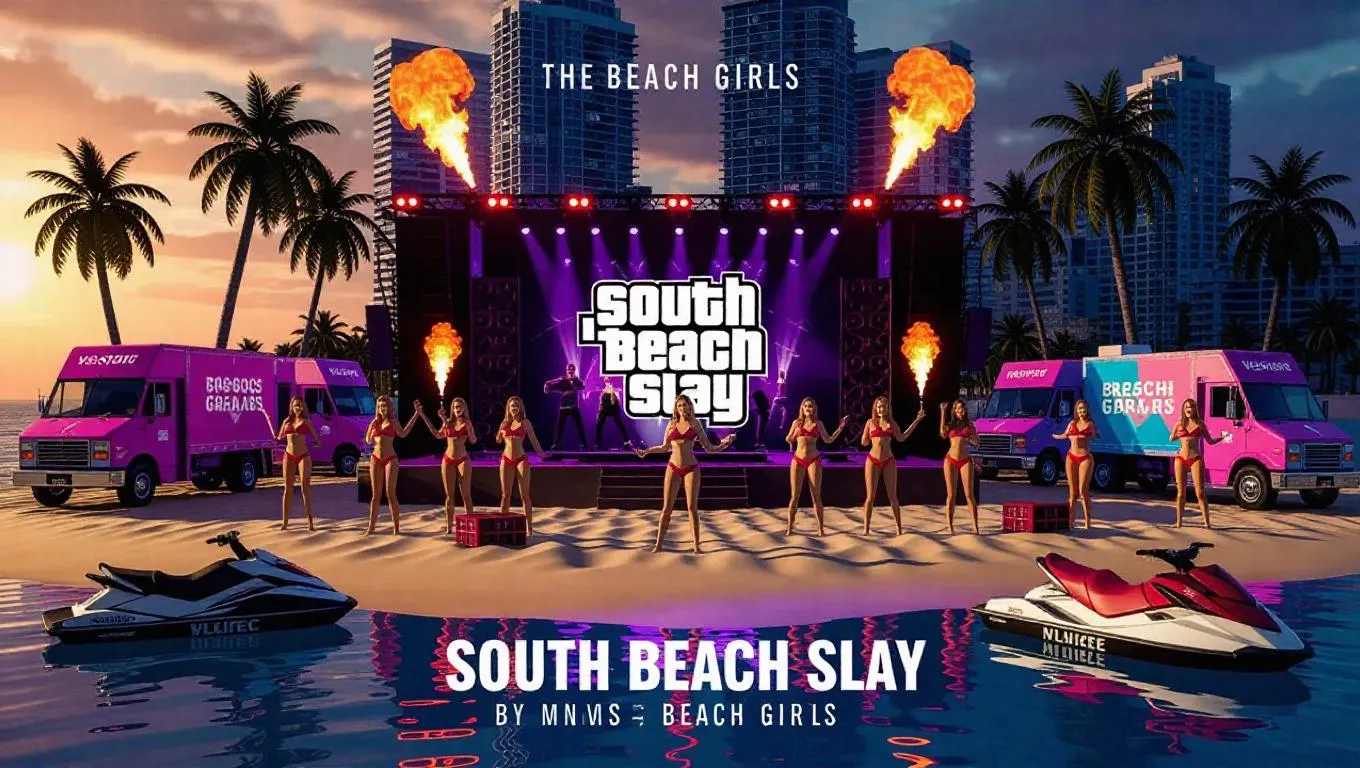 Animated 16:9 cinematic loop for the music video “South Beach Slay” by The Beach Girls. Scene opens with a GTA V-style view of South Beach at golden hour. The beach transforms into a full-on GTA nightclub takeover: LED trucks on sand, sound system vans, bikini-clad dancers, and chrome jet skis docked nearby. Palm trees sway under club strobes; visuals project onto skyscrapers behind. Fire breathers, glitch visuals, and dancing NPCs in “Vespucci Heat” gangwear fill the background. At the center stage: The Beach Girls — Roxy (in flaming orange and gold), Luna (silver skin and chrome outfit), Zaya (tattooed punk bikini), and Kiki (black-and-yellow cyber bombshell) — lead the show. The camera weaves between dancers and fireworks explode in GTA V-style arcs above the pier. Clean but electric. GTA meets TikTok meets pure slay.