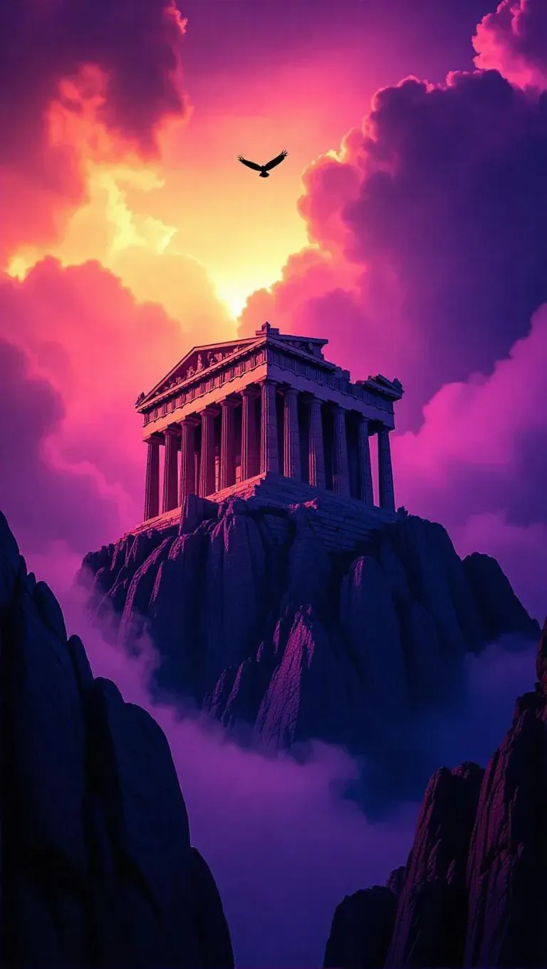 A majestic classical temple crowns a rugged mountain peak, columns soaring toward stormy purple skies. Golden light slashes through turbulent clouds, casting divine radiance. Perfect symmetry and intricate details highlight timeless architecture. A lone eagle glides above, rocky outcrops framing the sacred site, enhancing its isolation and grandeur.