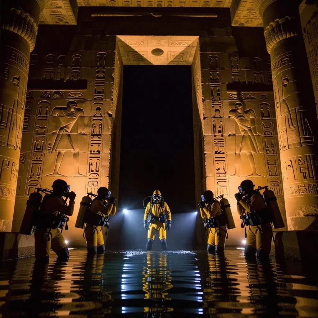 Explore ancient Egyptian ruins submerged underwater with AI-generated imagery. Divers in yellow wetsuits illuminate a carved hieroglyphic portal using flashlights, revealing intricate stone carvings and murky depths. Perfect for AI image/video creation, blending archaeology, scuba adventure, and dramatic underwater lighting effects. Craft professional visuals of mysterious aquatic explorations with Vivago.ai's creative AI tools.