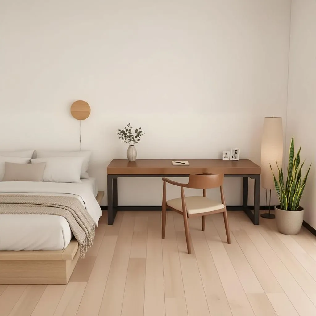 Transform your reference table into a minimalist bedroom scene with vivago.ai. Blend the table naturally into Scandinavian/Japanese-inspired decor featuring wood accents, white walls, and clean lines. Achieve seamless integration while preserving its design, using AI for effortless visual content creation with neutral tones and soft lighting. Perfect your minimalist interior vision.