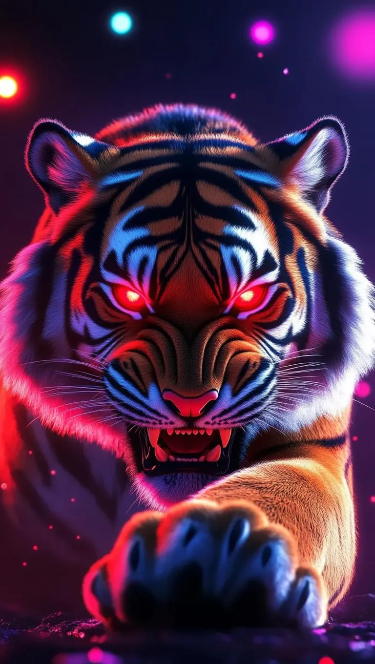 Vivid AI-generated image of a fierce tiger with glowing red eyes, sharp teeth, and a dominant low-angle stance. Features cosmic purple-pink hues, glowing orbs, and dramatic red lighting for intense realism. Perfect for AI-powered wildlife art, digital storytelling, or dynamic visual projects. Create stunning animal portraits with vivago.ai's advanced image generation tools.
