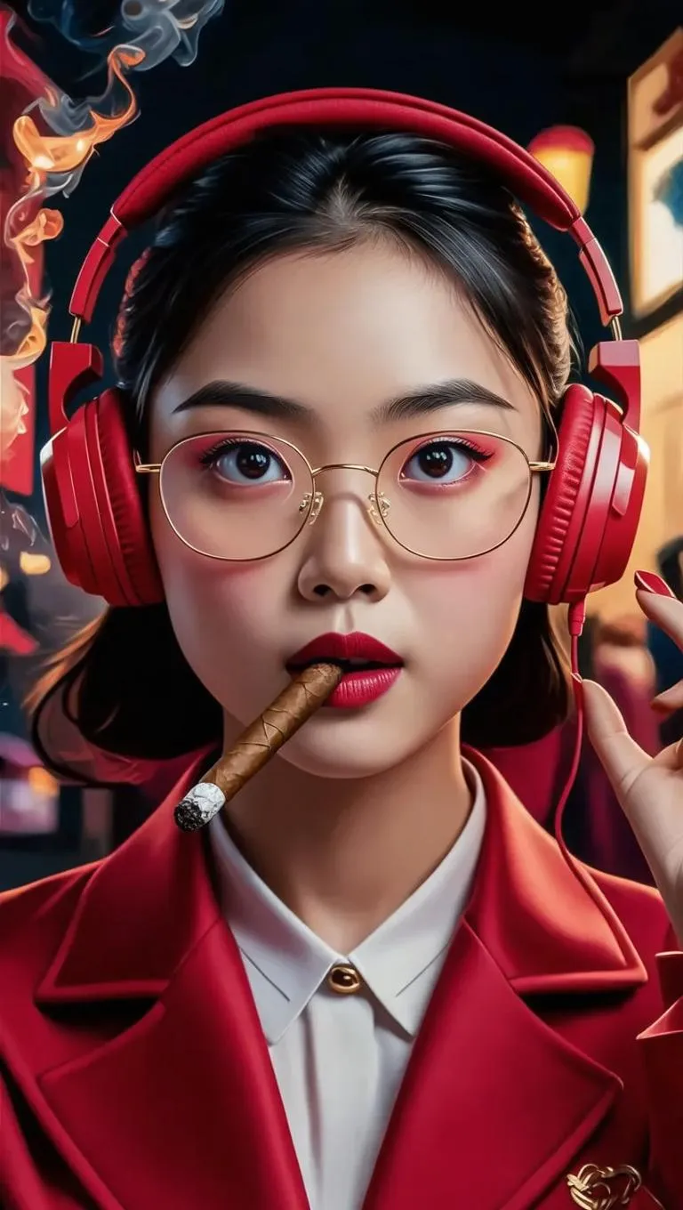 Experience AI-generated cinematic artistry with this visionary Chinese character portrait. Vivago.ai crafts striking visuals blending intellectual curiosity (symbolized by glasses), bold confidence (vivid lipstick), urban edge (red headphones), and enigmatic allure (cigar). Our AI image generator transforms text prompts into stunning visuals, perfect for digital artists seeking He Jiaying-inspired contemporary Asian beauty aesthetics.