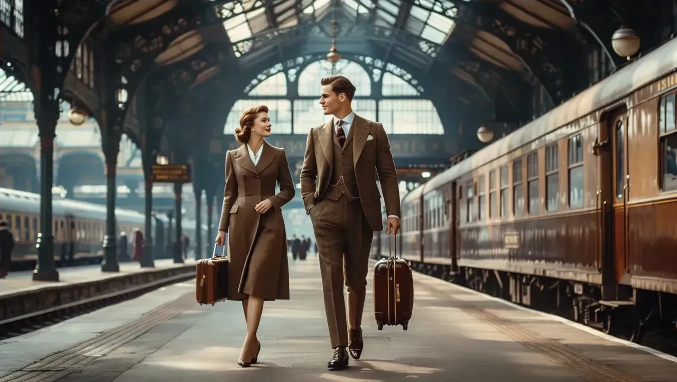 Create an AI-generated scene of contrasting eras: a gentleman in vintage attire awaits on a train platform while a modern-dressed woman approaches. Perfect for historical vs contemporary fashion storytelling with vivago.ai's AI image tools for striking visual narratives and style juxtapositions.