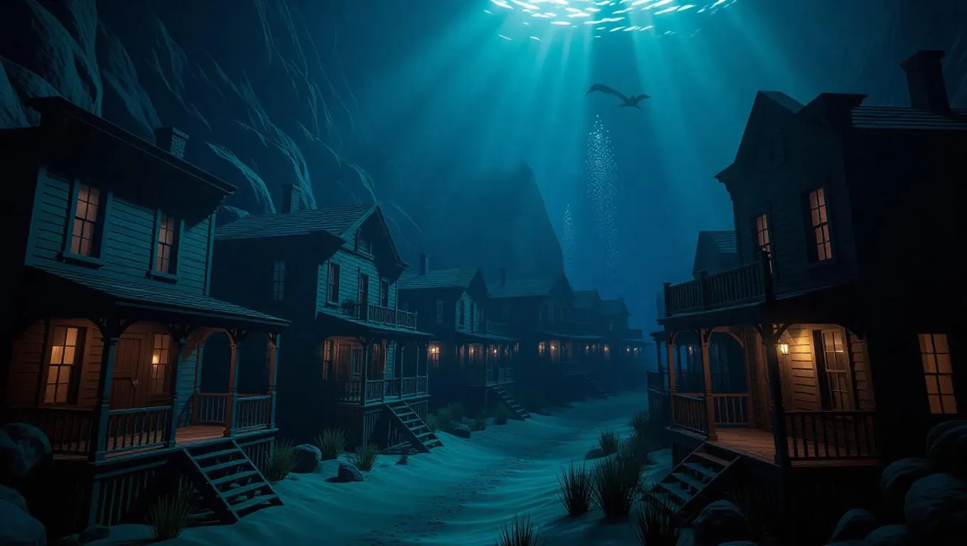 A hyper-realistic, cinematic scene set deep under the sea, featuring a submerged western town with old western buildings and people living in it. The environment is bathed in deep sea colors with super clarity, enhanced by cinematic lighting that highlights the textures and details of the underwater structures and the inhabitants. The composition should evoke a sense of wonder and mystery, with a perspective that captures the vastness of the underwater world, possibly a wide-angle shot to include the entire town. The lighting should be dramatic, with rays of light piercing through the water to create a melancholic yet awe-inspiring atmosphere. The art style should be hyper-realistic, with attention to the smallest details to make the scene as lifelike as possible.