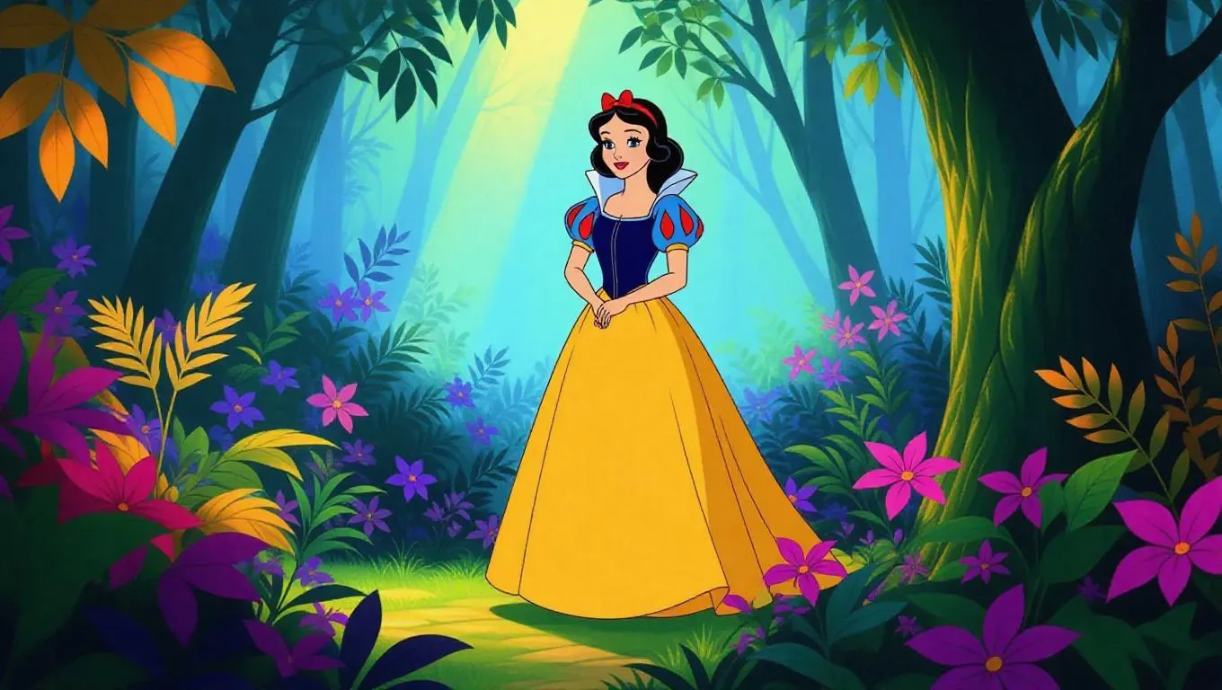 Generate a vintage-style AI image of a 40-year-old Snow White in her iconic outfit, exploring an enchanted forest. Inspired by Max Fleischer's retro animation, this AI effect blends fairy-tale nostalgia with mature reimagining for timeless, professional-grade creative visuals.