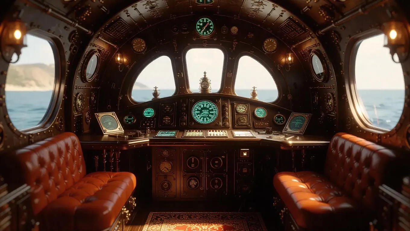 High quality, 8K, Ultra HD, Highly detailed, High contrast, Accurate lighting, Perfect Cinematic photo, Steampunk copper submarine control center interior, intricate switchboards, steampunk monitors, expansive windows, ultra-detailed, extremely realistic, photorealistic, epic composition, masterpiece, warm ambient lighting, polished brass fixtures, vintage gauges, plush velvet upholstery, ornate wood paneling.