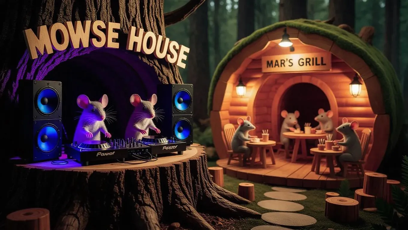 Generate AI-powered visuals of "Mowse House" mouse DJs spinning house music in a glowing, moss-covered woodland scene. Vibrant AI art features cozy tree stump stages, electronic amps, and lively mice crowds at Mar's Grill. Perfect for creating whimsical, professional-grade AI images or videos with creative editing tools.