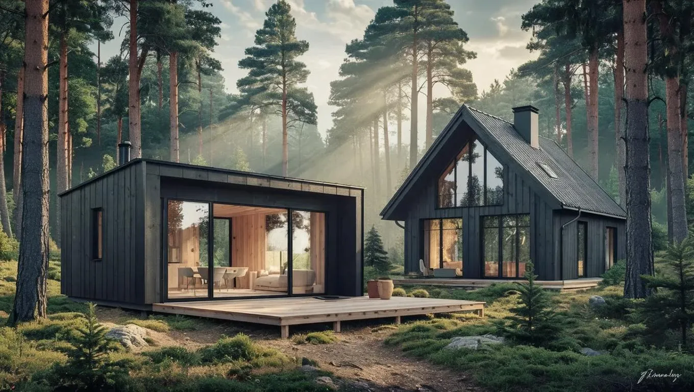 Discover a harmonious blend of modern shed design and semi-modern Latvian architectural style nestled in a serene forest. Elevate AI-generated visuals for creative projects with this unique woodland retreat concept. Perfect for architectural visualization, nature-inspired art, and immersive storytelling via advanced AI image generation tools.