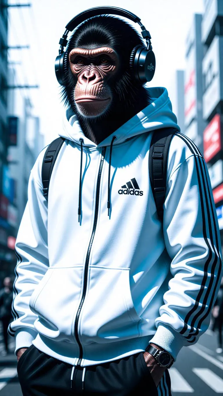 Generate futuristic AI art of a cyberpunk monkey in a neon-lit tracksuit and headphones, blending urban edge with digital innovation. Vivago.ai crafts bold, full-body visuals in cyberpunk style, merging cool aesthetics and cutting-edge AI effects for standout, professional-grade creative content.