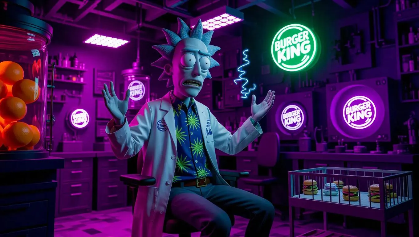 AI-generated surreal sci-fi art of Rick Sanchez in a chaotic interdimensional lab inventing a quantum portal baby carrier. Features holographic neon equations, pickled Morty clones, pulsating fusion reactors, floating Burger King crowns, and chromatic distortion. Combines hyper-detailed sci-fi chaos, DIY spaceship-crib hybrids, and warped perspectives for trippy, dimension-hopping visuals.