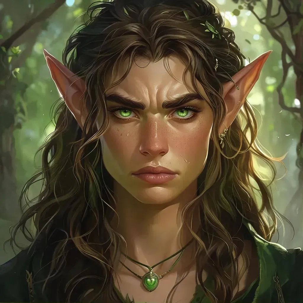 Generate mystical AI fantasy portraits of lunar elves with heterochromatic green eyes, fair skin, and messy brown hair using vivago.ai. Create expressive elf characters showcasing warm tones, intricate elf ears, and emotions like annoyance or sorrow. Ideal for fantasy art, character design, and storytelling visuals.
