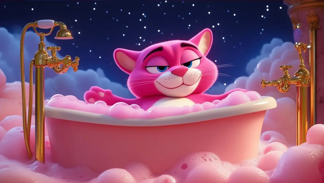 Generate a playful AI image of the Pink Panther lounging in a pink bubble bath with vibrant bubbles. Use vivago.ai's AI effects to transform text prompts into whimsical visuals, blending retro charm and modern creativity for eye-catching, professional-grade results.