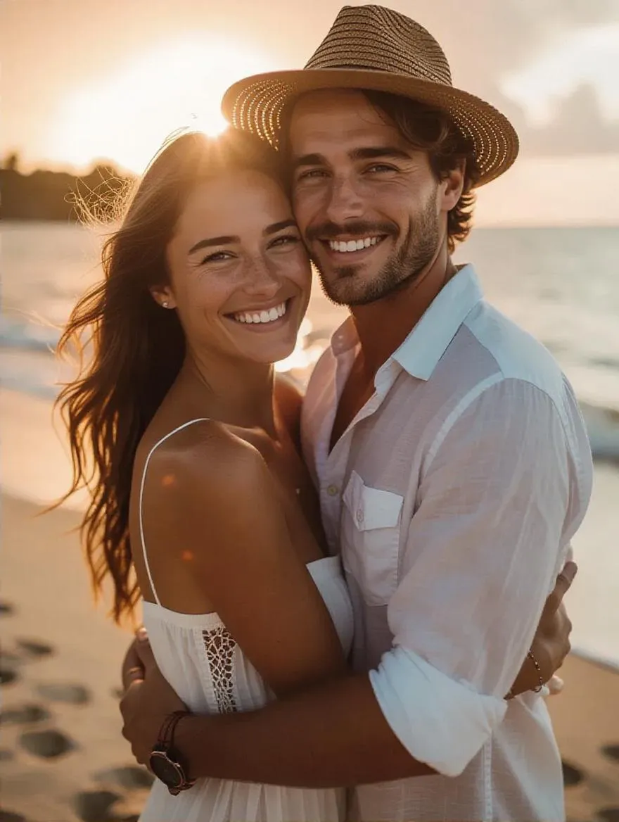 Generate romantic AI couple photos at sunset beaches. Create cinematic visuals with perfect lighting and dreamy atmospheres. Our AI transforms prompts into Instagram-perfect, share-ready images of smiling couples embracing. Instantly produce dreamy, professional-quality AI-generated visuals.
