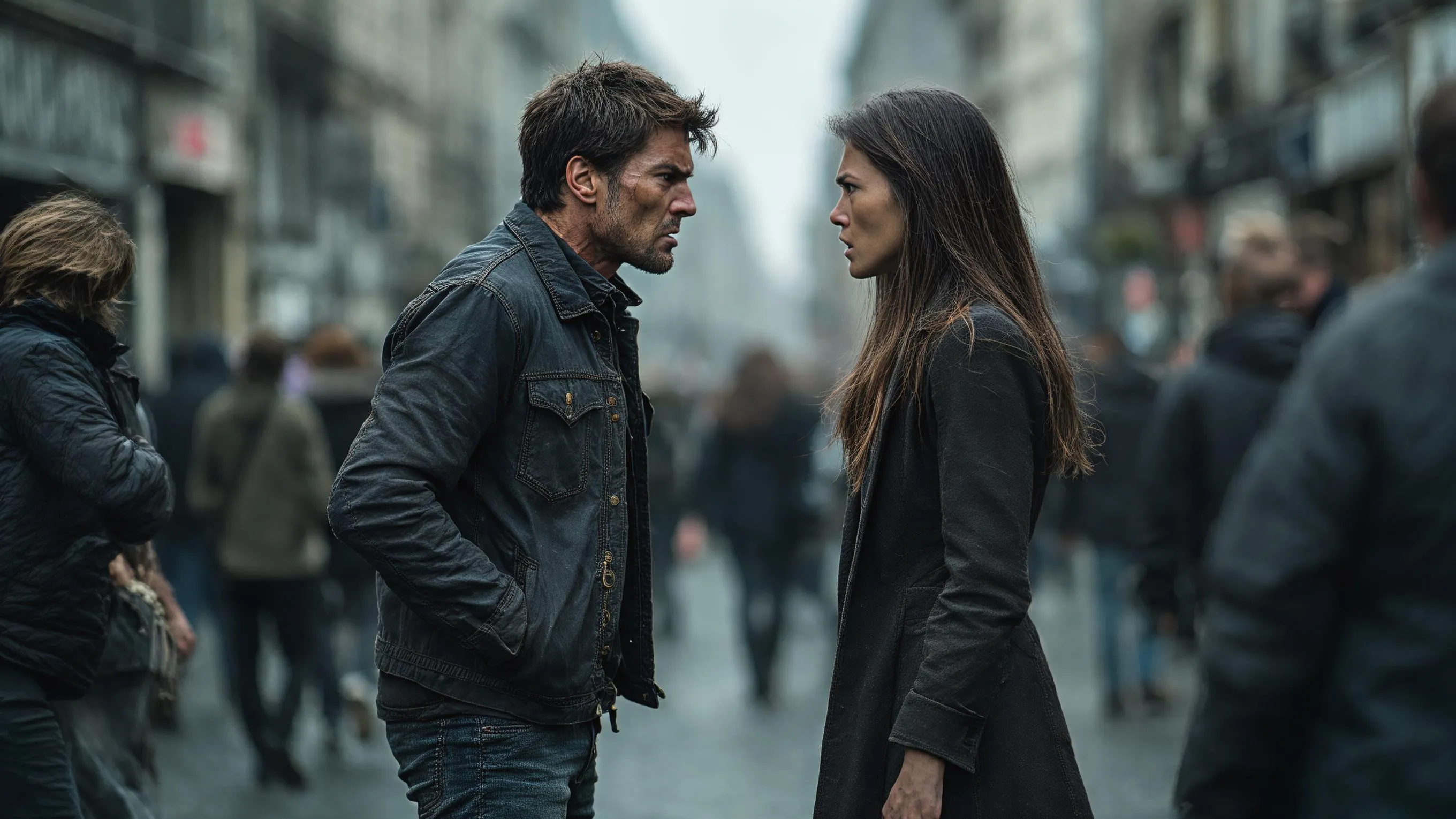 Generate realistic AI photos of angry couples in urban crowds. Create somber city street scenes with emotional tension using vivago.ai's AI image generator. Perfect for dramatic, photo-realistic crowd imagery with intense facial expressions.