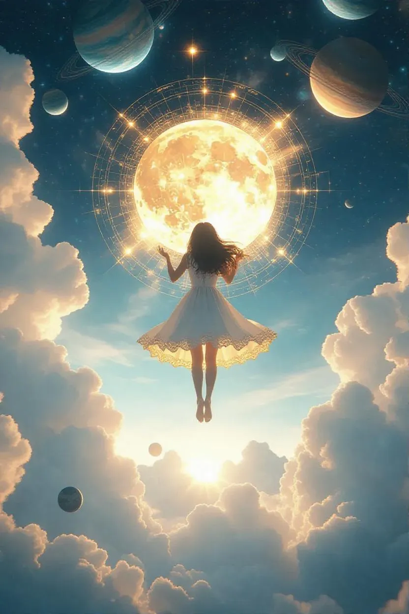 Create AI-generated art of a mystic girl floating above celestial clouds with a cosmic map, bathed in transparent gold sunlight. Featuring a sky woven from planets, ethereal clouds, and apocalyptic grandeur. Transform prompts into surreal visuals with VivaGo.ai's AI image tools for stunning, otherworldly creations.