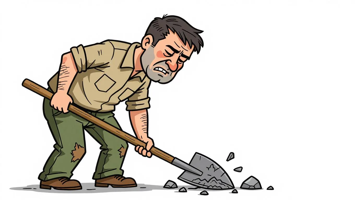 The image shows a cartoon illustration of a USSR man standing on the ground with a shovel in his hand. He is wearing a khaki-colored shirt and green pants. His clothes are looking like so poor. He has short dark hair and is holding the shovel with both hands. His eyes are closed and his mouth is slightly open, as if he is in pain or discomfort. There are several rocks scattered around him, suggesting that he has been working for. The background is white.