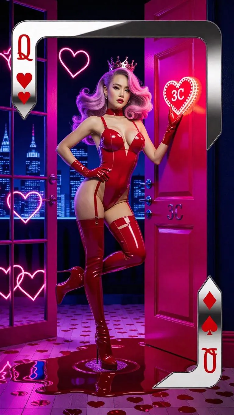 Rosé (Roseanne Park) reimagined as the Queen of Hearts, sleek and radiant, framed in a glossy anime-style poker card. Center: She stands in a crimson vinyl bodysuit with translucent panels, rose petals cascading behind her. Her pastel-pink hair flows like silk, eyes glowing amber under nightclub lights. Leaning against an apartment door marked “3C”, holding a glowing heart-shaped keycard, one leg bent, heel sunk into a glittering spilled drink. Background: neon skyline through glass windows, heart-shaped holograms floating. Card frame: chrome red, pixelated heart symbols at each corner, flickering like broken LEDs. Nameplate: “Queen of Hearts – APT. Temptress” in cyber calligraphy. Aura: seduction, secrets, soft vocals in a dark room. ???? Matches lyric: “Don’t you want me like I want you, baby…”