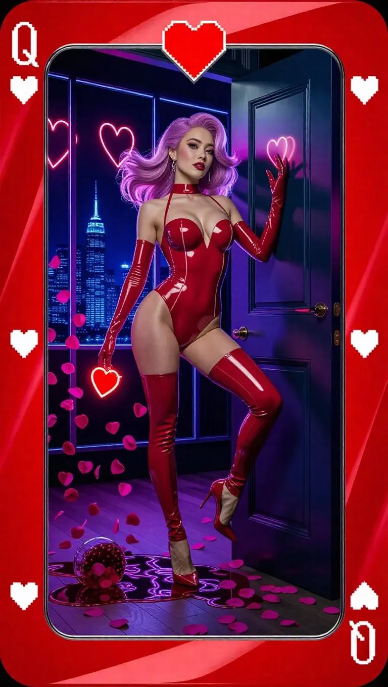 Rosé (Roseanne Park) reimagined as the Queen of Hearts, sleek and radiant, framed in a glossy anime-style poker card. Center: She stands in a crimson vinyl bodysuit with translucent panels, rose petals cascading behind her. Her pastel-pink hair flows like silk, eyes glowing amber under nightclub lights. Leaning against an apartment door marked “3C”, holding a glowing heart-shaped keycard, one leg bent, heel sunk into a glittering spilled drink. Background: neon skyline through glass windows, heart-shaped holograms floating. Card frame: chrome red, pixelated heart symbols at each corner, flickering like broken LEDs. Nameplate: “Queen of Hearts – APT. Temptress” in cyber calligraphy. Aura: seduction, secrets, soft vocals in a dark room. ???? Matches lyric: “Don’t you want me like I want you, baby…”